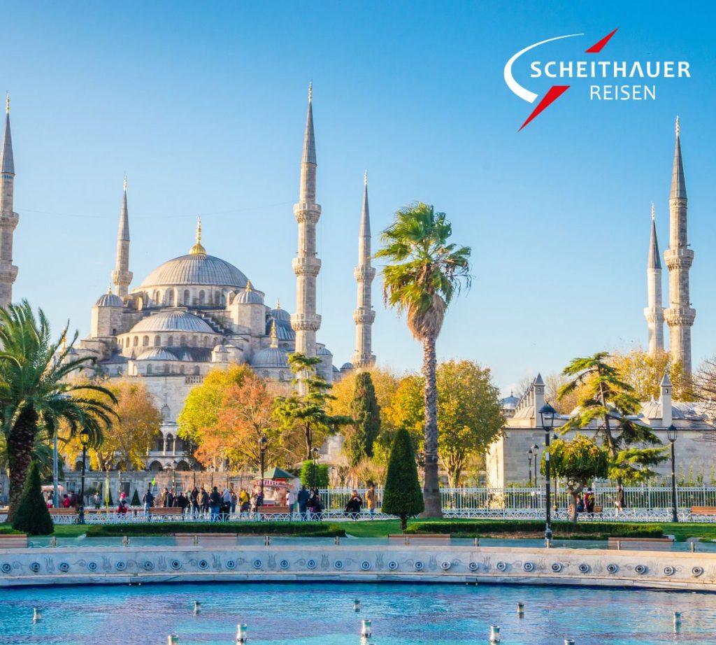 Istanbul (Türkei). Sehenswürdigkeiten gibt es zu viele um Sie alle an einem Tag zu besuchen. Eine der faszinierendsten Städte der Welt. Hagia Sophia, Blaue Moschee, Topkapi-Palast und der riesige Große Basar liegen dicht beieinander. Wer es romantisch mag, unternimmt eine Bootsfahrt auf dem Bosporus – mit Blick auf Europa und Asien gleichzeitig. Durch die späte Abfahrt bleibt Zeit Istanbul auch im Abendlicht zu erleben.